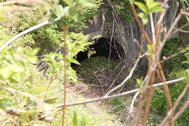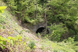 2つ目のトンネル入口は土砂崩れのためか半分埋まっていた。以前はその土砂に水平面があったため坑口を覗ける所まで行けた。現在は水平面がなくなったので、足を滑らすと信濃川へ真っ逆さま。 (2005.5/2005.5/2015.5)