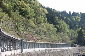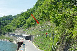 旧線は川沿いの道路の擁壁の上ぎりぎりを走っていた。 (2005.5/2015.5)