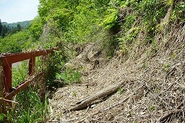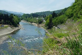 廃止後、土砂崩れ防止用の鉄柵がつけられたようだ。途中で路盤が土砂で埋まってしまっている。そこから見える信濃川はきれいである。 (2005.5)