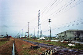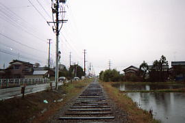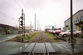 線路の撤去中。踏切部分はまだ残っており、線路は枕木だけが残っている所も多かった。 (1999.12)