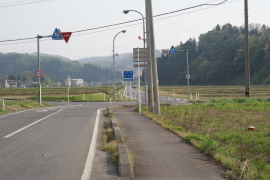 大蒲原手前の旧道との交差点。廃線跡は直進していたはずだが、”旧道”が斜めに横切っているため道路は。直交。 (2008.4)