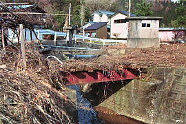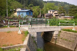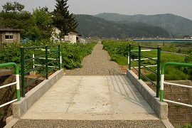 集落を走る廃線跡にぽつんと残っていた鉄橋跡。今は前後が砂利道となり、コンクリート橋に架け替えられている。