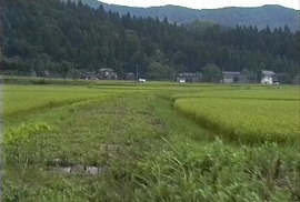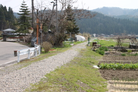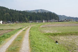 集落を抜けて駒岡へ延びる廃線跡。今は農道となっている。赤い屋根の建物は加茂勤労者体育センター。