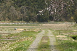狭口から延びてくる廃線跡。今ははっきり轍が残り、以前より増して農道化している。3枚目写真の右へ向かう小道は廃線跡ではない。