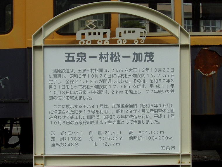 五泉市総合会館(五泉高校前)に保存されているモハ41。解説板と車内に出入りのための階段がついている。(看板はクリックすると拡大) (2005.3)