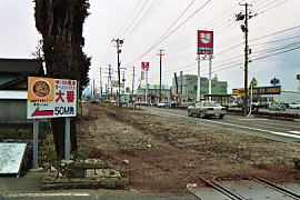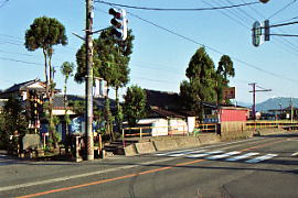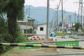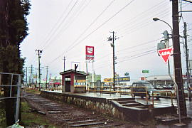 道路側から見たホームと待合室。手前が五泉側。踏切の警報機には黒い網が被せられていた。線路とホームが徐々に撤去されていった。