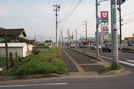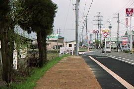 歩道となった部分がホームの位置。線路のあった所は草が生え、脇に生えていた木は切られてしまった。現在線路跡まで歩道が広げられている。