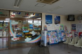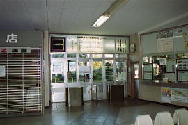 駅舎とバス乗り場、駅舎内部。廃止直後の列車時刻表はバス時刻表に取り替えられていた。外見は現在も変わっていないが、内部の改札口付近は蒲鉄トラベルの窓口になった。