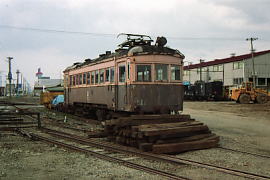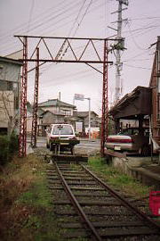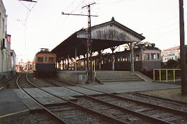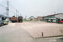 駅舎前のホームにモハ71(左)、クハ10(その後方)、モハ12(右)、モハ41(その後方)が移動されていた。モハ12は、廃車後長年雨ざらしだったのでぼろぼろである。