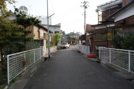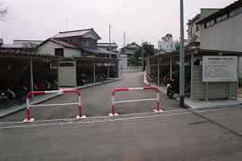 駅の南側の県道との踏切跡。部分廃止後はここまで線路があった。全線廃止後は舗装され駐輪場と通路になった。