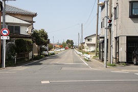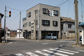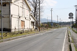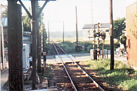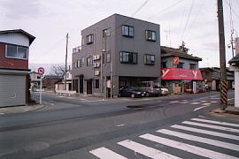 アパートのある位置が駅跡。左奥へ延びる道路が村松へ向かう廃線跡。かつて隣の商店が切符を売っていたが、閉店したようだ。 (1999.3/2013.4/2019.4)