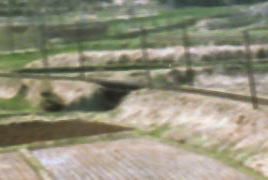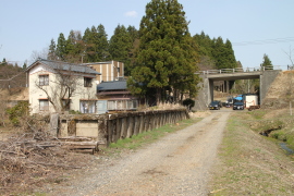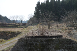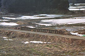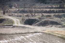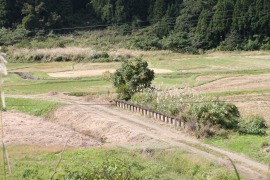国道290号線跨線橋から撮影した高松駅ホーム跡とその先の廃線跡。廃線跡は農道として使われているが、盛土が削られ不自然な格好に見える。その先の橋があった所だけ盛土が残っている。