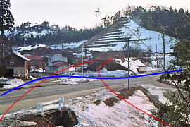 土倉駅より冬鳥越側の鉄橋跡を見る。鉄道は赤線のように通り、道路は青線のように鉄道をくぐっていた。冬鳥越側の橋台は残っているが、土倉側はなくなっている。