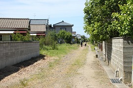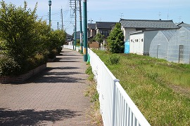 住宅地の中を走る。バラストや草もなく散歩にはちょうどよいようだ。廃線跡脇に歩道ができたところもある。 (2010.6)