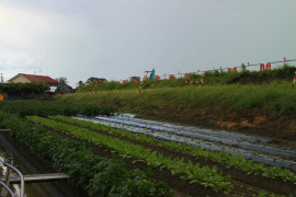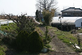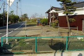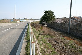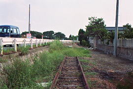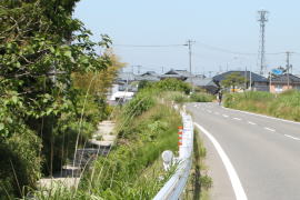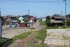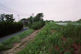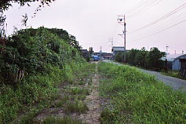 廃線跡が道路に沿う辺り。この先の路盤は早々と道路に埋まってしまった。