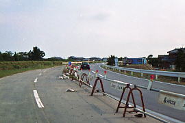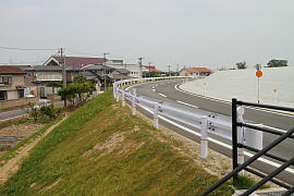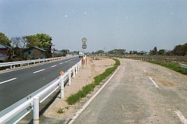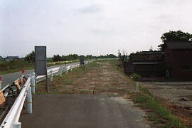 堤防沿いの道路に沿った廃線跡は新しい道路の下となった。