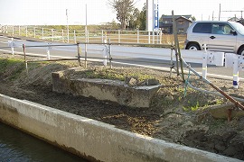 木場駅の新大野側に残る廃線跡と橋台。この小川は電鉄廃止後コンクリートで改修された。
