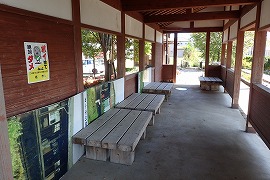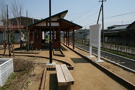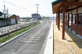 ホーム上には休憩所が建ち、ホーム前には線路が埋め込まれている。