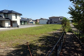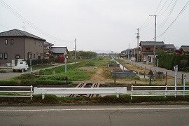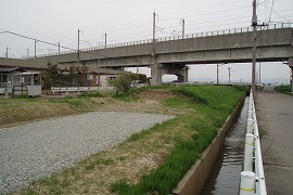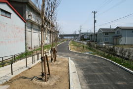 上越新幹線との立体交差の手前。遊歩道化のため盛土が削られ、途中にあった鉄橋が撤去された。2008年には遊歩道はここまで延び、そこに今は柵ができている。2010.5にはできていた。