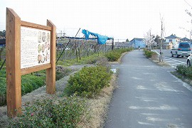 千日駅脇の跨線橋から曲までは遊歩道となっており、途中には電鉄跡だという記述のある看板が立てられている。(写真の看板をクリックすると説明が読めます) (2004.4)