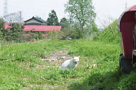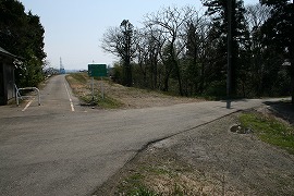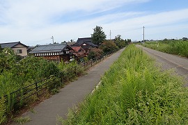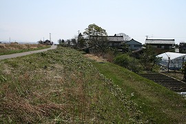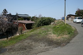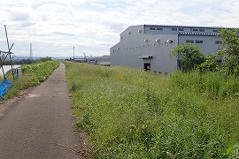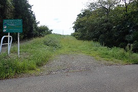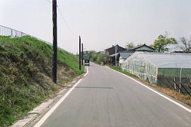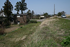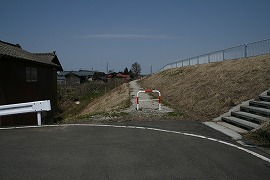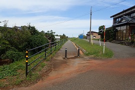 舗装道路がカーブするところで、以前はバラストの残る廃線跡が現れたが、今は堤防に上がるためのスロープとなった。 (2001.4/2008.4)