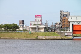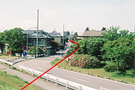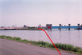 同地点から対岸を見る。水門脇の建物に向かってほぼ直線的に延びていた。 (2002.5/2012.8)