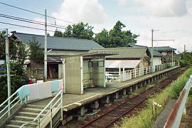 ホームや階段の手すりを住民が物干し台として使っていた。ホーム下に廃止通知の看板が置いてあった。 (1999.8)