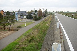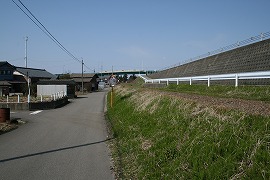 廃線跡に線路が残っていた頃。堤防と道路の間を走っている。