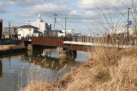 西川手前の用水を渡る鉄橋も残っていた。桁を利用して遊歩道にした。