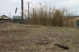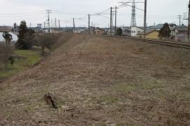 旧線の盛土が新線に沿って残っている。橋台のあった場所はススキが伸びている。