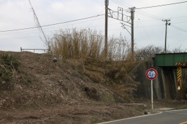 旧橋梁の橋台は既にない。その下には何かの基礎が残っていた。おそらく車の高さ制限の枠の跡であろう。 (2011.2)