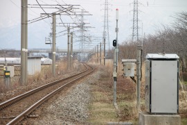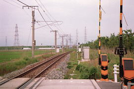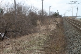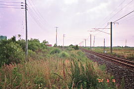 踏切から京ヶ瀬側を見る。右の草やぶが旧線跡。現在線が不自然にカーブし、旧線と合流しているのがわかる。