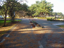 公園内の廃線跡をしばらく歩くと舗装道路が分かれている所がある。ここが駅跡か?交換可能駅だったのでそれを意識してこうしたのかも。 (1992.9/2004.11)